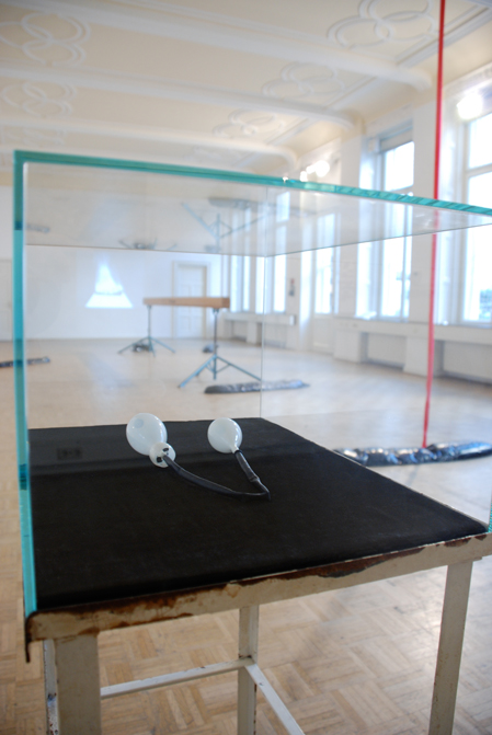 Die von Okularisten mundgeblasenen hohlen Objekte sind mit einem feinem Gummischlauch verbunden und liegen auf Samt gebettet, gleich kostbaren Instrumenten aus einer vergangenen Zeit oder von besonderer Behandlung zeugend in einer alten, aufgemöbelten Vitrine aus der stationären medizinischen Versorgung.