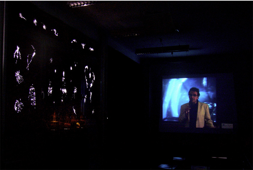 The video in front shows the microtheater-hall at the Natural Historical Museum of Vienna, where the lecture took place (Silitubiflex Obscurum). Here a biologist speaks about the rediscovered animal Silitubiflex Obscurum. The amorph animal lives in the deep mud and moves foreward with its tentacles. Behind the explaining biologist there is a canvas, where the visitor may observe the animal under the microscope. The microscope is standing left hand side, where cameras are directly connected, so the life studied animal is visible for the visitors.