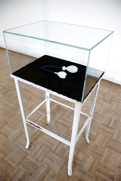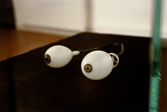 Die von Okularisten mundgeblasenen hohlen Objekte sind mit einem feinem Gummischlauch verbunden und liegen auf Samt gebettet, gleich kostbaren Instrumenten aus einer vergangenen Zeit oder von besonderer Behandlung zeugend in einer alten, aufgemöbelten Vitrine aus der stationären medizinischen Versorgung.