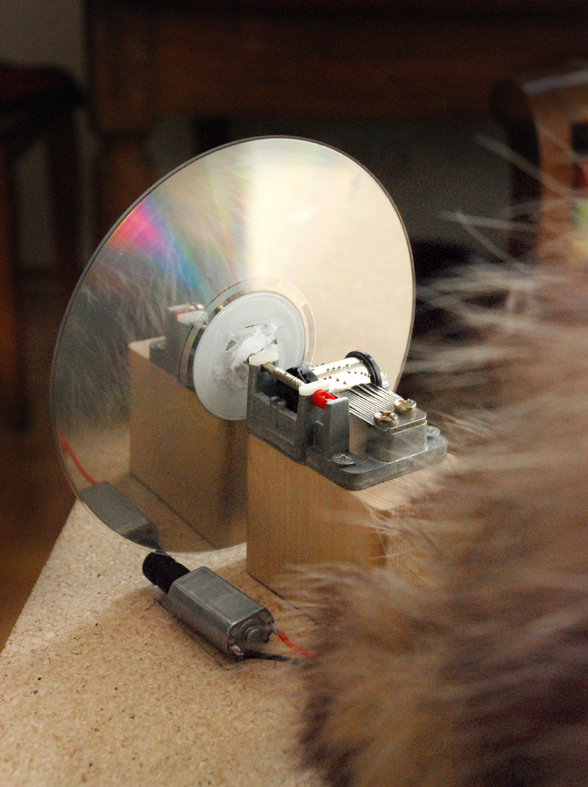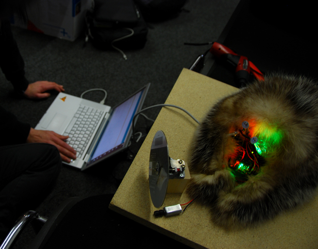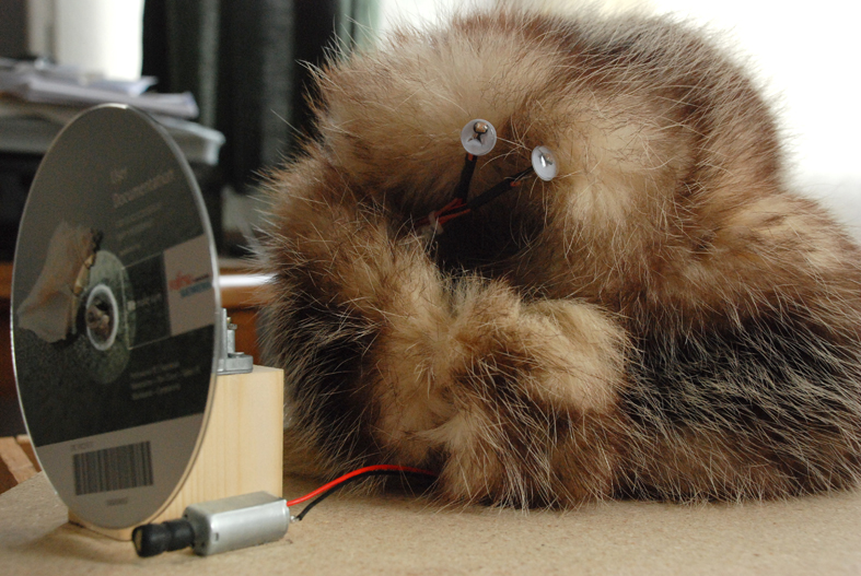 in case of being blinded, its getting really nervous. While its breath is accelerating to a maximum, the motor which turns the disc to crank the little musicbox freaks out. It calms down in a dark surrounding and seems to feel save, relaxed and cosy then, purring like a little kitten...